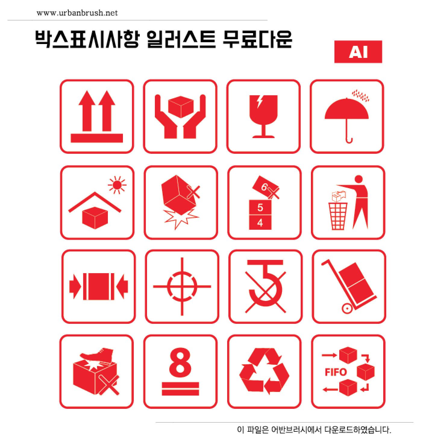 [KR] 안녕하세요. 어반브러시의 Master Creator Tommy입니다. 아래 이미지는 박스 표시사항 일러스트 ai 파일 샘플입니다. 박스를 적재하거나 포장시에 박스의 내용물을 보호하기 위하여 표시하는 아이콘들을 모아놓은 일러스트 이미지입니다. 파일을 다운받아 박스 표시사항과 관련된 디자인물에 활용하세요.