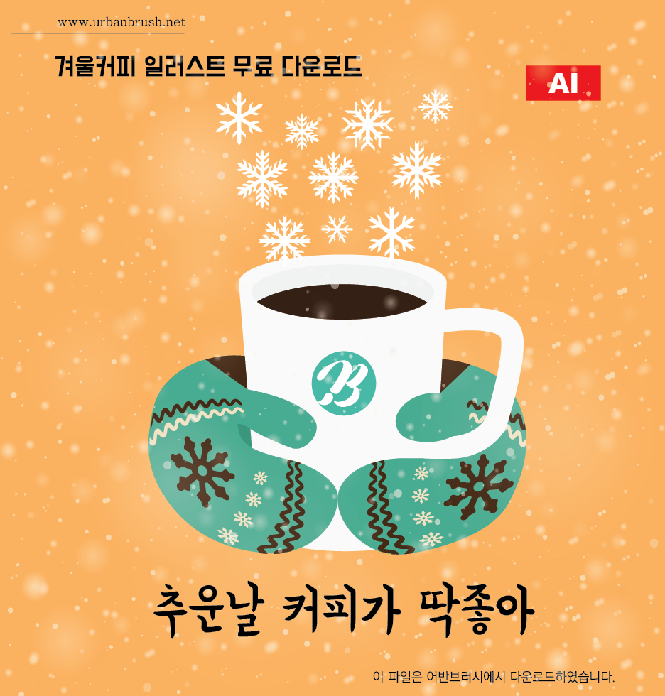 [KR] 안녕하세요. 어반브러시의 Master Creator Tommy입니다. 아래 이미지는 겨울 커피 일러스트 ai 파일 샘플입니다. 겨울 벙어리 장갑을 낀채로 함박눈이 내리는 날 커피를 들고 손을 녹이는 듯한 모습을 묘사한 일러스트 이미지입니다. 커피연기 대신 눈결정을 사용하여 겨울의 이미지를 강조하였습니다. 커피숍, 커피전문점, 커피판매점 등에서 활용할 수 있는 겨울시즌 커피 일러스트 이미지입니다. 파일을 다운받아 커피관련 디자인물에 활용해보세요.