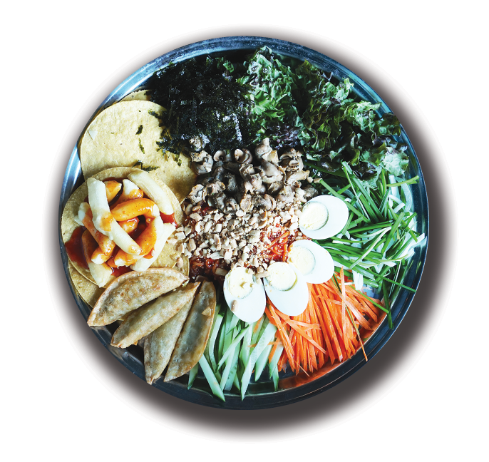 골뱅이뿐만아니라 다양한 야채와 쫄면, 계란, 튀김류 등이 한 쟁반에 다오는 퓨전식 골뱅이무침입니다.