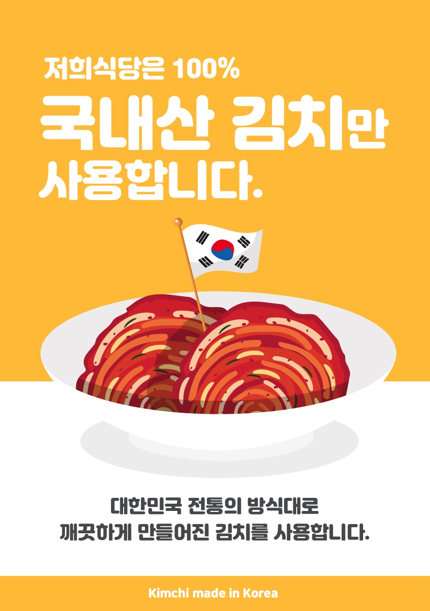 [KR] 안녕하세요. 어반브러시의 Master Creator Tommy입니다. 아래 이미지는 국내산 김치 안내문 일러스트 샘플입니다. 국내산 김치만을 사용한다는 식당 문구를 표현한 일러스트 이미지입니다. 중국산이나 외산의 김치가 아닌 깨끗한 대한민국 김치를 사용한다는 문구를 넣은 안내문을 묘사한 일러스트 이미지입니다. A4 사이즈로 제작되어 바로 출력해서 사용가능합니다. 김치, 국내산, 원산지, 대한민국, 식당, 음식점 등과 관련된 카테고리에서 활용하기 적합한 일러스트 이미지입니다. 국내산 김치 안내문 일러스트 일러스트 벡터파일을 다운받아 원산지와 관련된 디자인물에 활용해시고, 그래픽 디자인 의뢰가 필요하시면 카카오톡 "디자이너 타미"를 검색해서 연락해주세요(작업 의뢰 분야 : 로고제작, 브랜딩, 전단지, 포스터, 리플릿 홍보물, 브랜딩, 캐릭터 등).