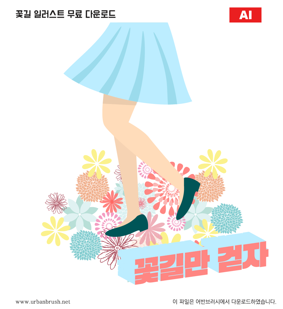 [KR] 안녕하세요. 어반브러시의 Master Creator Tommy입니다. 아래 이미지는 꽃길 일러스트 ai 파일 샘플입니다. “꽃길만 걷자, 꽃길만걸어요”라는 문구로 새해, 소망, 위로, 희망 등의 카테고리에서 활용할 수 있는 일러스트 이미지입니다. 치마를 입은 여성이 꽃 위를 걷고 있는 모습을 묘사한 일러스트 이미지입니다. 파일을 다운받아 꽃길과 관련된 디자인물에 활용해보세요.