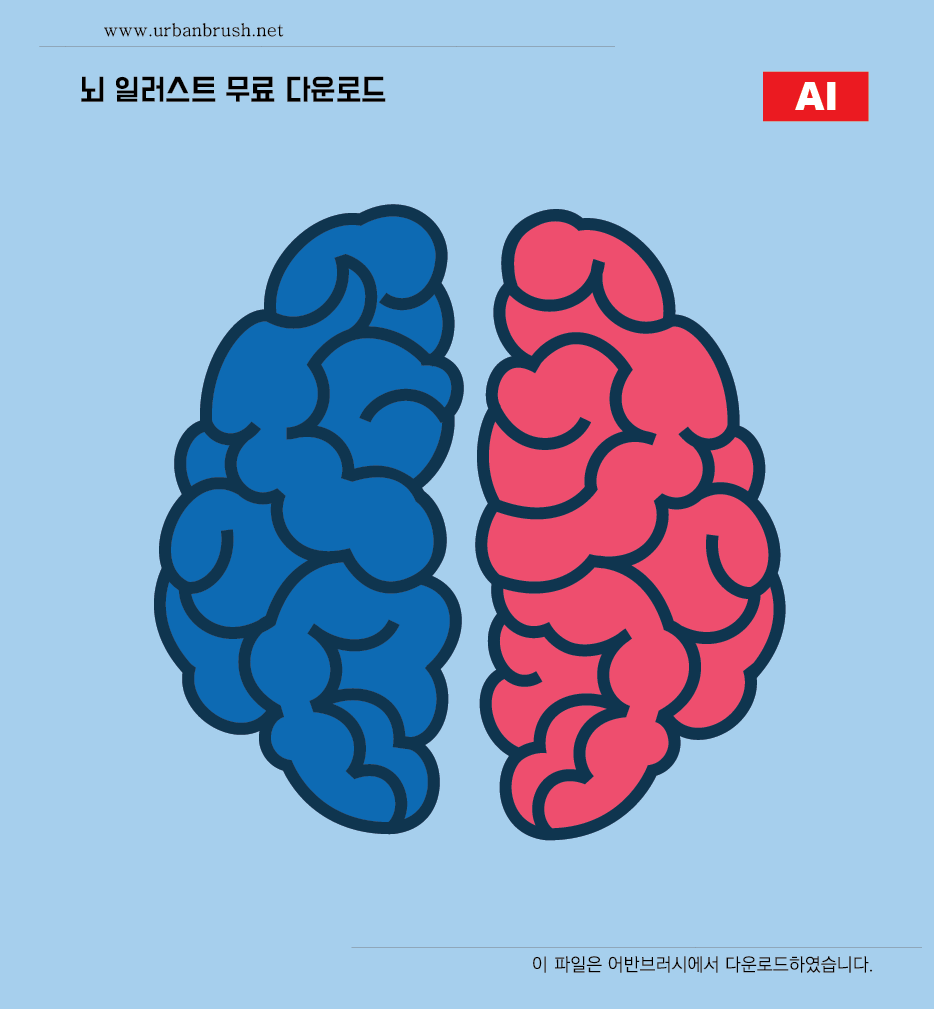 [KR] 안녕하세요. 어반브러시의 Master Creator Tommy입니다. 아래 이미지는 뇌 일러스트 ai 파일 샘플입니다. 좌뇌와 우뇌가 색상으로 분리가 되어 있는 뇌 일러스트 이미지입니다. 병원이나 의료기관, 보건소 등에서 활용할 수 있는 일러스트 이미지입니다. 파일을 다운받아 뇌와 관련된 디자인물에 활용해보세요.