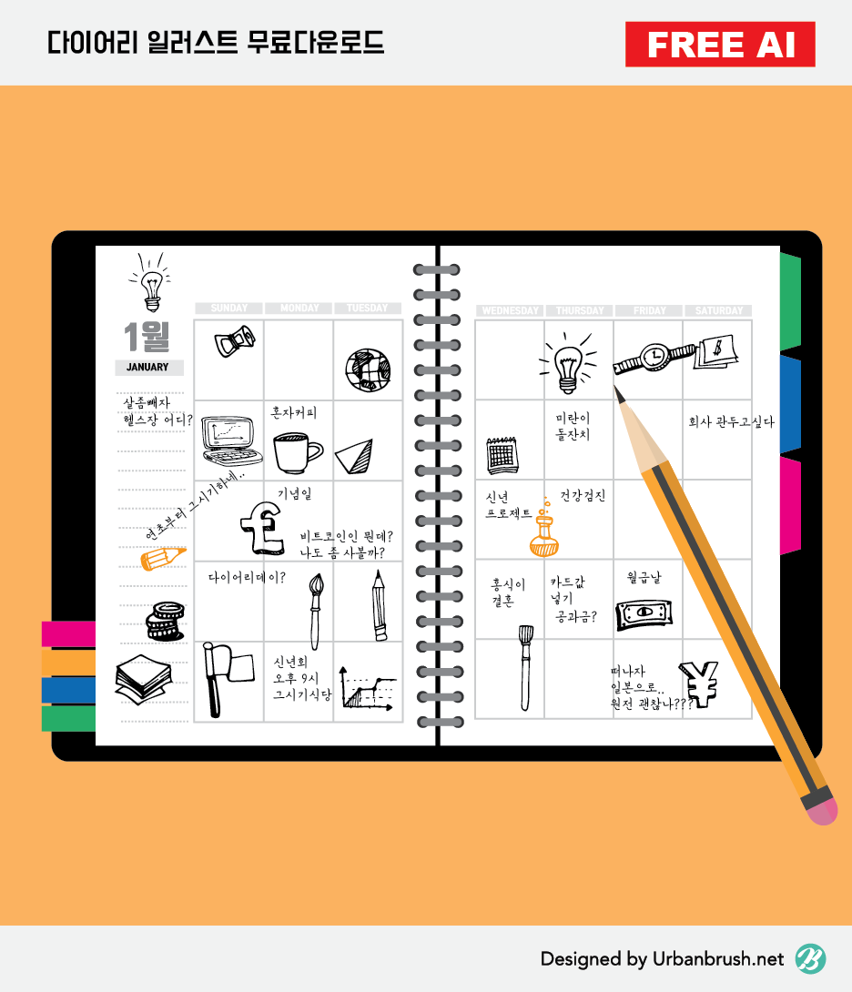 [KR] 안녕하세요. 어반브러시의 Master Creator Tommy입니다. 아래 이미지는 다이어리 일러스트 ai 파일 샘플입니다. 메모형식이 아닌 캘린더 형식으로 되어 있는 다이어리를 모델로 하여 제작한 일러스트 이미지입니다. 스케줄을 짤 수 있도록 날짜별로 칸이 나누어져 있으며, 다양한 낙서가 포함되어 있습니다. 좌우측으로 포스트잍과 책깔피, 그리고 다이어리 위에는 연필 일러스트가 포함되어 있습니다. 파일을 다운받아 다이어리와 관련된 디자인물에 활용해보세요.