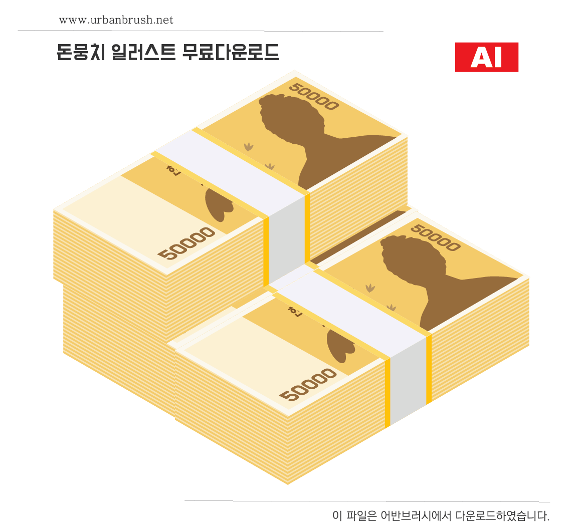 [KR] 안녕하세요. 어반브러시의 Master Creator Tommy입니다. 아래 이미지는 돈뭉치 일러스트 ai 이미지 파일입니다. 한국은행 오만원권이 다발로 있는 일러스트 이미지입니다. 금융이나, 부자, 투자, 보험, 투자 등과 같은 카테고리에서 활용할 수 있는 돈뭉치 일러스트 이미지입니다. 파일을 다운받아서 돈뭉치에 관한 디자인물에 활용해보세요.