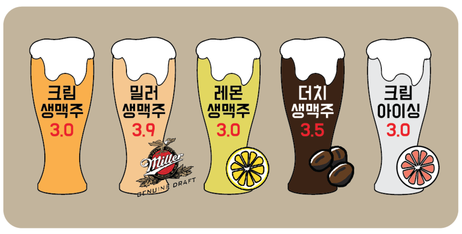 파일에는 크림생맥주, 밀러생맥주, 레몬맥주, 더치맥주,크림아이싱이 있습니다.