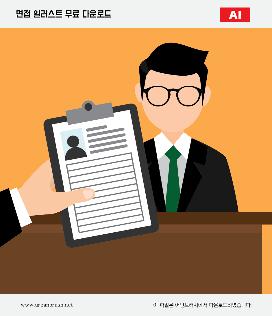 [KR] 안녕하세요. 어반브러시의 Master Creator Tommy입니다. 아래 이미지는 면접 일러스트 ai 파일 샘플입니다. 면접관이 면접자의 이력서를 손으로 들고 면접을 진행하고 있는 모습을 묘사한 일러스트 이미지입니다. 면접, 인터뷰, 취업, 직장, 구인, 구직 등과 관련된 카테고리에서 활용할 수 있는 일러스트 이미지입니다. 파일을 다운받아 면접과 관련된 디자인물에 활용해보세요.