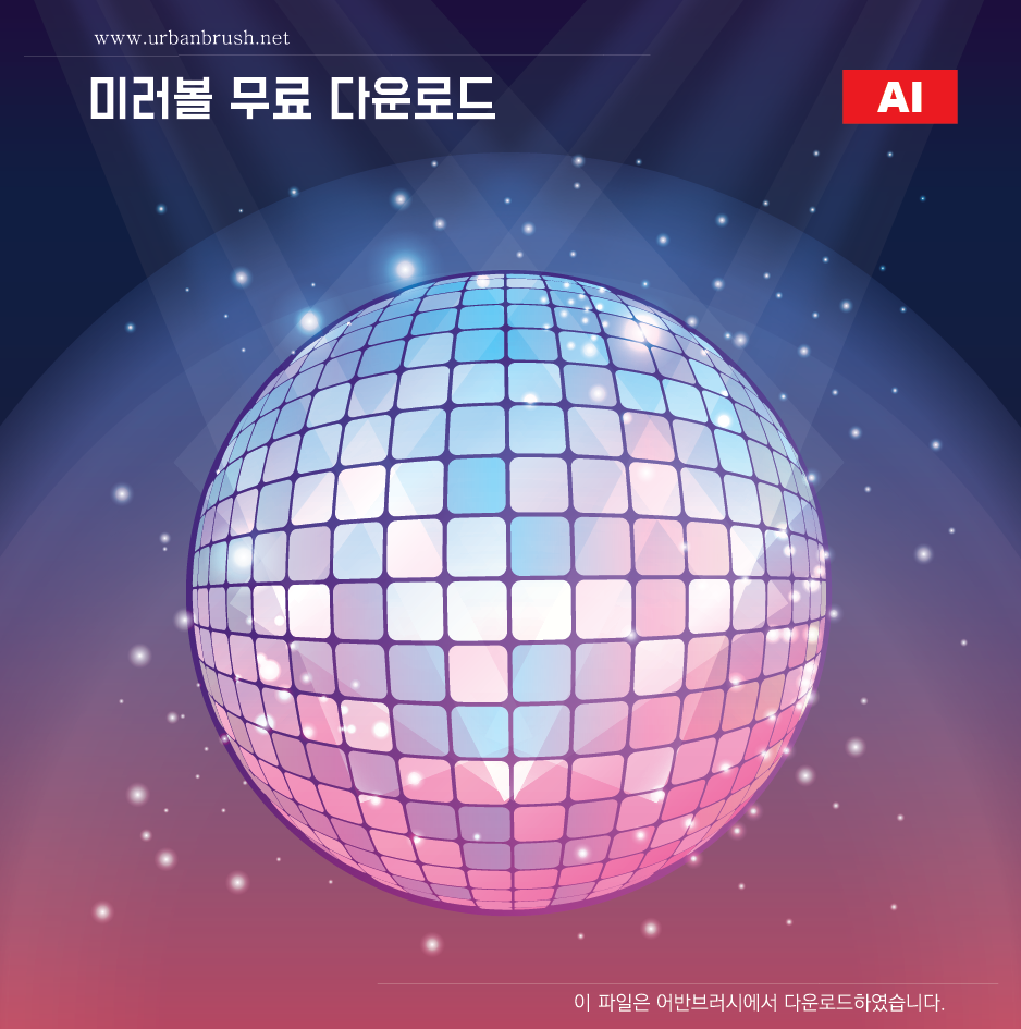 [KR] 안녕하세요. 어반브러시의 Master Creator Tommy입니다. 아래 이미지는 미러볼 일러스트 ai 파일 샘플입니다. 파티나 클럽, 노래방과 같은 카테고리에서 활용할 수 있는 미러 일러스트 이미지입니다. 반짝이는 미러볼과 조명배경이 잘 조화된 일러스트 이미지입니다. 파일을 다운받아서 미러볼 관련 디자인물에 활용해보세요.