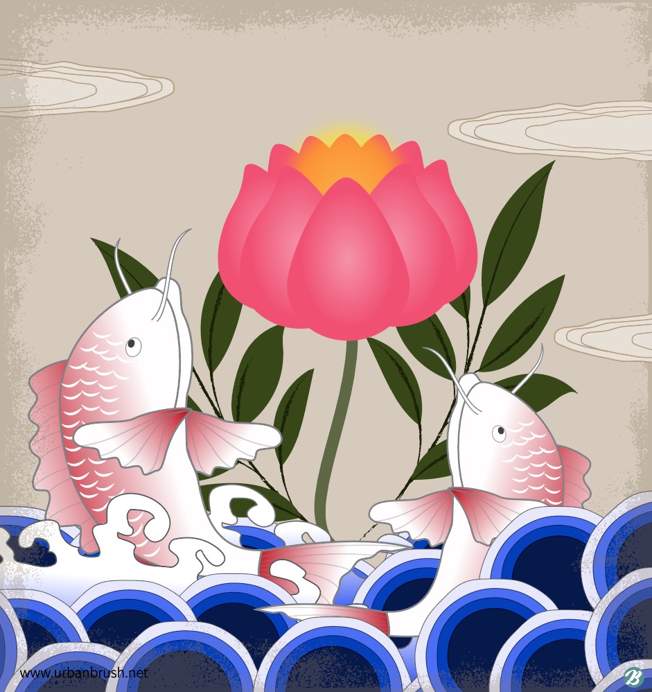 [KR] 안녕하세요. 어반브러시의 Master Creator Tommy입니다. 아래 이미지는 민화 물고기 일러스트 ai 샘플입니다. 민화느낌으로 표현한 붕어 일러스트 이미지입니다. 물고기 두마리가 연꽃을 향하여 점프하고 있는 장면을 민화느낌으로 묘사한 일러스트 이미지입니다. 붕어, 민화, 물고기, 연못, 연꽃 등과 관련된 카테고리에서 활용하기 적합한 일러스트 이미지입니다. 민화 물고기 일러스트 ai 일러스트 벡터파일을 다운받아 전통그림과 관련된 디자인물에 활용해보세요.