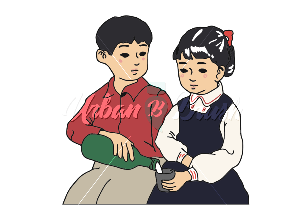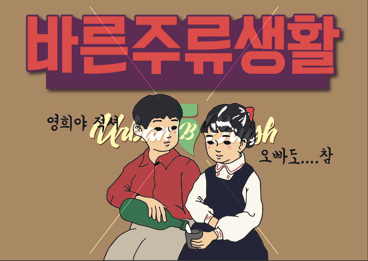 철수가 영희에게 소주를 따르는 장면이 그려져 있는 복고풍 일러스트입니다.