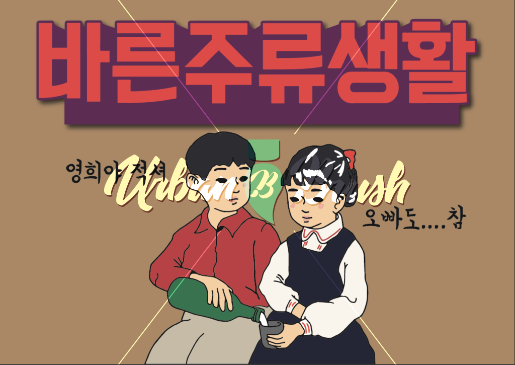 철수가 영희에게 소주를 따르는 장면이 그려져 있는 복고풍 일러스트입니다.