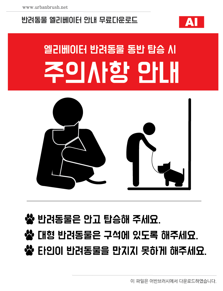 [KR] 안녕하세요. 어반브러시의 Master Creator Tommy입니다. 아래 이미지는 반려동물이 출입가능한 건물의 엘리베이터 탑승시 안내 주의 사항 일러스트 ai 파일 이미지 샘플입니다. 반려동물의 공격으로 인해 타인을 해치는 경우가 빈번하게 발생하고 있기 때문에 반려동물이 엘리베이터에 함께 탑승할 때 주의사항을 안내할 목적으로 제작된 안내문입니다. 파일을 다운받아서 반려동물 엘리베이터 동반탑승 안내문을 제작해보세요.