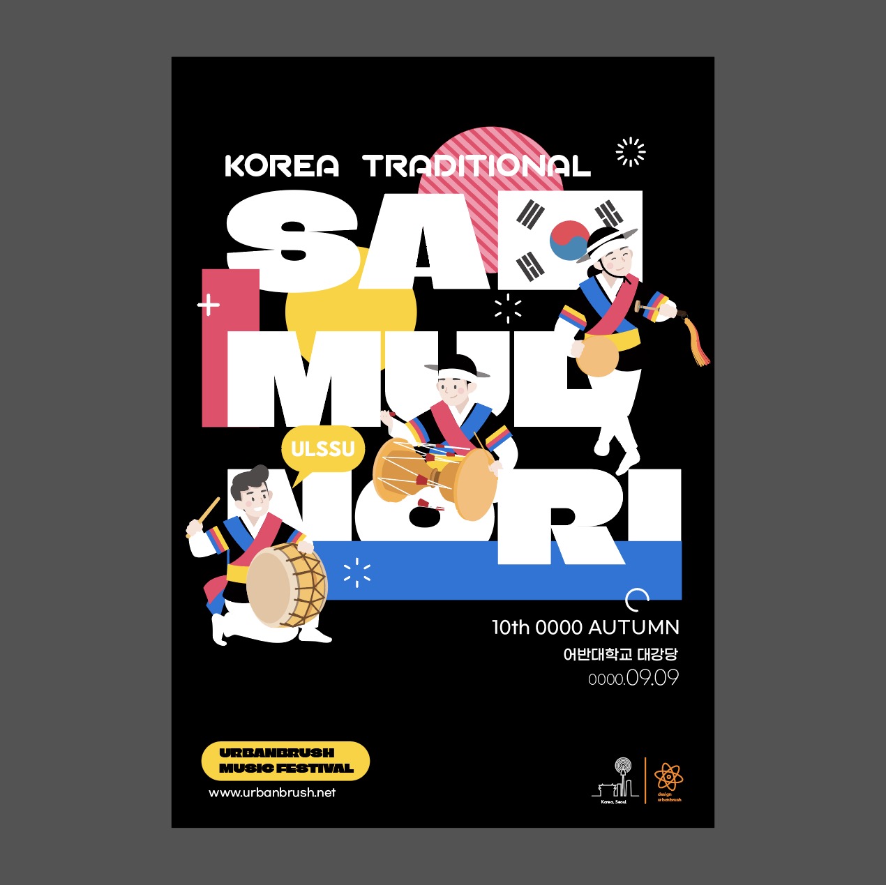 [EN] Hi. This is Urban Brush’s Master Creator Tommy. The image below is a sample of a Samulnori Nongak poster template illustration ai. This is a poster template illustration image centered on the text Samulnori. This is an illustration image depicting a Pungmul band holding traditional instruments. This is an illustration image suitable for use in categories related to poster design, Pungmul, Nongak, musical instruments, traditional instruments, traditional costumes, janggu, buk, kkwaenggwari, and folk games. Download the Samulnori Nongak poster template illustration ai vector file and use it for designs related to Samulnori. If you need to request a graphic design, please search for “Designer Tommy” on KakaoTalk and contact us. The included fonts are examples and are not included in the file. Please contact the font company for usage.