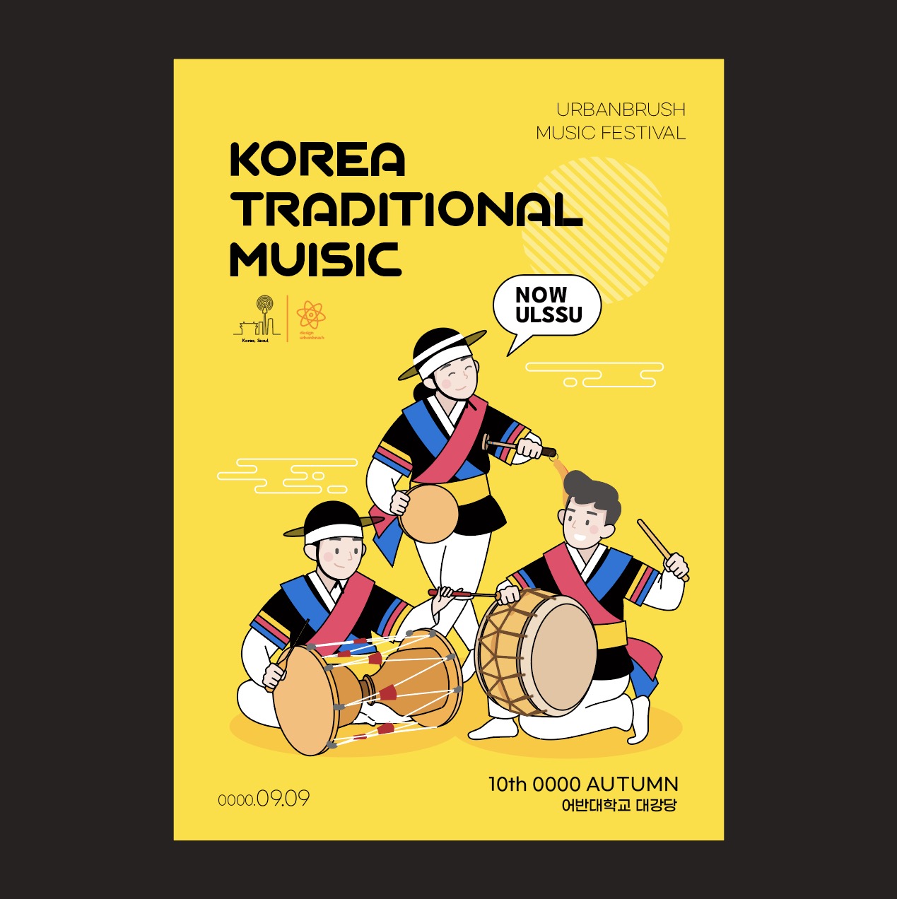 [EN] Hi. Hello, I’m Tommy, the Master Creator of Urban Brush. The image below is a sample of a poster illustration ai of Samulnori and Nongak Pungmul. This is a poster illustration image that focuses on the image of Samulnori. This is an illustration image depicting a Pungmul band holding various traditional instruments. This is an illustration image suitable for use in categories related to Samulnori, folk games, Pungmul bands, janggu, kkwaenggwari, buk, traditional drums, Nongak, traditional clothing, etc. Download the Samulnori traditional Nongak Pungmul poster illustration ai vector file and use it for designs related to Samulnori. If you need to request a graphic design, please search for “Designer Tommy” on KakaoTalk and contact us. The included fonts are examples and are not included in the file. Please contact the font company for usage.