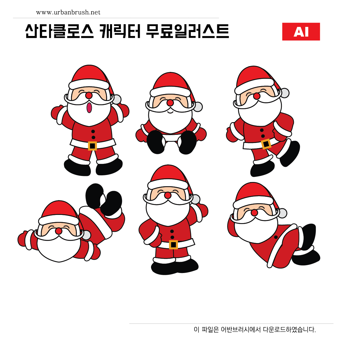 [EN] Hi. Urban Brush’s Master Creator Tommy. The image below is a sample Santa Claus character ai file. Includes six different Santa Claus character look and motion. It is a basic character illustration image that can freely utilize the design related to Christmas. Download the file and use it for Christmas related designs.