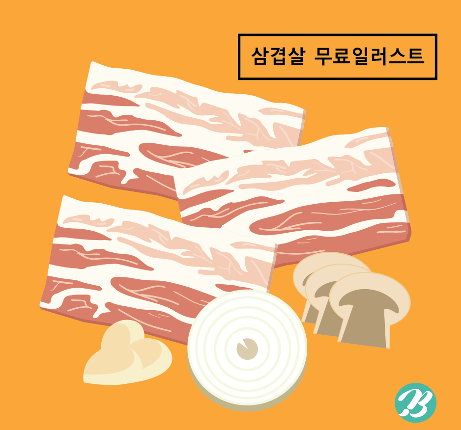 삼겹살을 구워먹을 때 같이 먹는 양파, 버섯, 마늘 일러스트도 포함되어 있습니다.