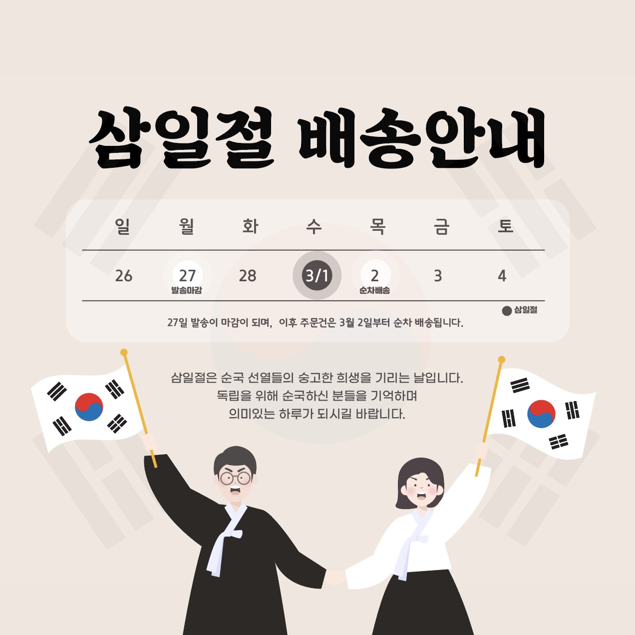 추천 카테고리 : 삼일절 배송안내, 3월, 독립운동, 태극기, 택배안내, 배송일절, 3.1절, 광복절, March 1st delivery information, March, independence movement, Taegeukgi, courier information, delivery schedule, Section 3.1, Liberation Day