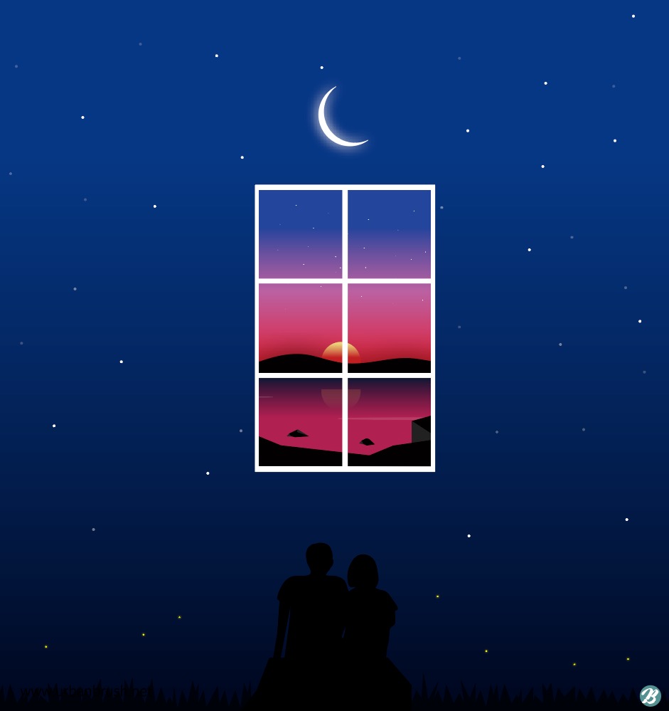 [EN] Hi. My name is Master Creator Tommy. The image below is a free sample of ai windows illustration. This is an illustration image of a couple looking together at the sunset scene over the window. Illustrated image depicting lovers sitting in the woods and watching the sunset reflected in the window. Illustration image suitable for use in categories related to sunset, sunset, window, lovers, couple, fantasy, etc. Download the sunset window illustration ai free illustration vector file and use it for your design related to sunset.