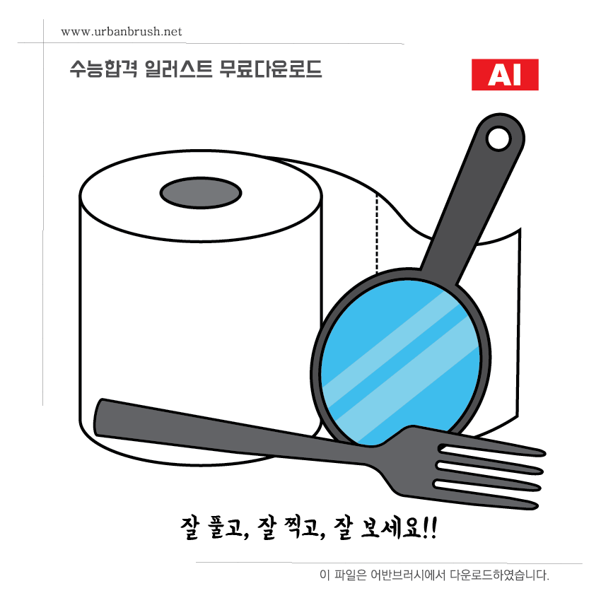 [KR] 안녕하세요. 어반브러시의 Master Creator Tommy입니다. 아래 이미지는 수능 합격 기원 등의 이미지에서 많이 사용되는 수능 일러스트 ai 이미지 샘플입니다. 수능 시험을 잘 보라는 의미로 많이 사용되는 화장지, 포크, 거울 이렇게 세개의 물건으로 이루어진 일러스트 이미지입니다. 화장지는 시험을 잘 풀라는 의미이고, 포크는 시험을 잘 찍으라는 의미, 마지막으로 거울은 시험을 잘 보라는 의미로 사용됩니다. 파일을 다운받아서 수능과 관련된 디자인물에 활용해보세요.