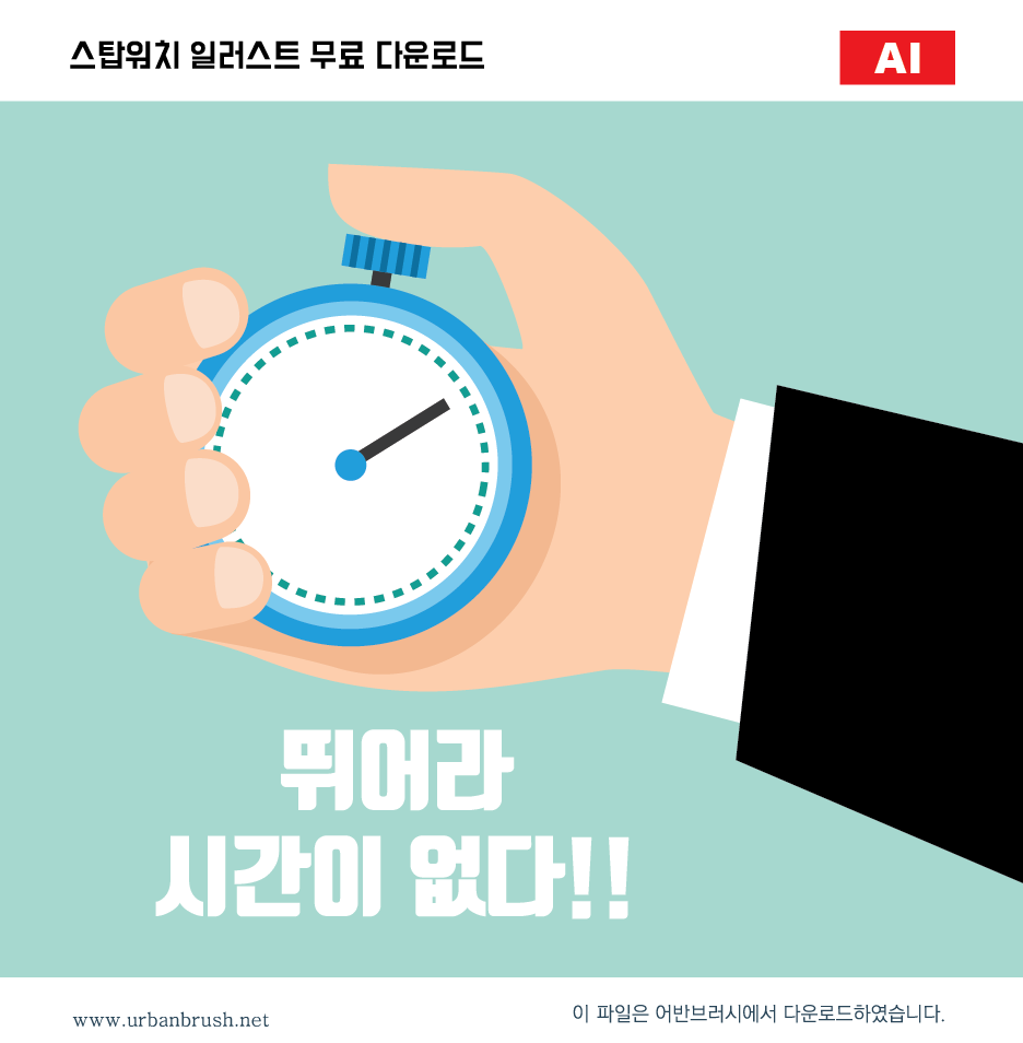 안녕하세요. 어반브러시의 Master Creator Tommy입니다. 아래 이미지는 스톱워치 일러스트 ai 파일 샘플입니다. 사람손이 스톱워치를 들고 버튼을 누르고 있는 모습을 묘사한 일러스트 이미지입니다. 시간, 기일, 디데이, 마감 등과 관련된 디자인물에 활용하기 적합한 일러스트 이미지입니다. 파일을 다운받아 스톱워치와 관련된 디자인물에 활용해보세요.
