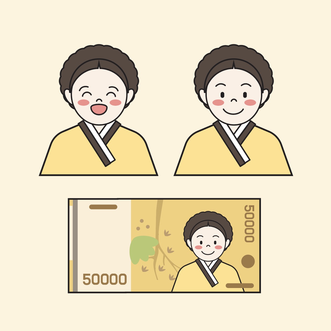 [EN] Hi. This is Urban Brush’s Master Creator Tommy. The image below is a sample of Shin Saimdang’s character illustration. This is an illustration image depicting Shin Saimdang and the 50,000 won bill. It is an illustration image depicting money with a drawing of Shin Saimdang. This is an illustrative image suitable for use in categories related to Shin Saimdang, money, economy, finance, 50,000 won, banknotes, etc. Download the Shin Saimdang character illustration vector file and use it for designs related to Shin Saimdang. If you need a graphic design request, search for “Designer Tami” on KakaoTalk and contact us. The included fonts are examples and are not included in the file. Please inquire with the font company regarding use.