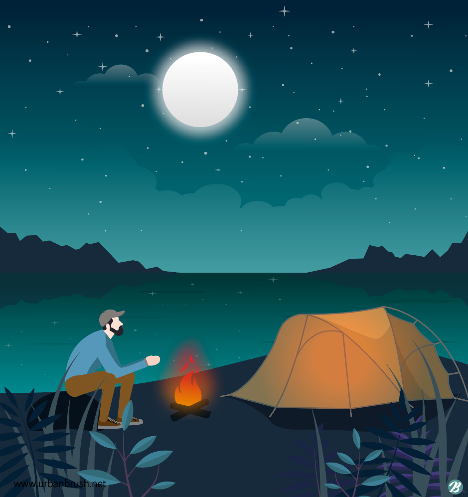 [EN] Hi. Urban Brush's Master Creator Tommy. The image below is aa free sample of night camping illustrations. It is an illustration image that expresses a camper sitting in front of a bonfire in a tent near a lake at night. It is an illustration image depicting a person enjoying camping under the bright night sky of the moon. This image is suitable for categories such as camping, camping, backpacking, tent, camping, night view, night sky, night scenery, lake, river and sea. Night camping illustration ai Download free illustration vector file and use it for design related to travel.