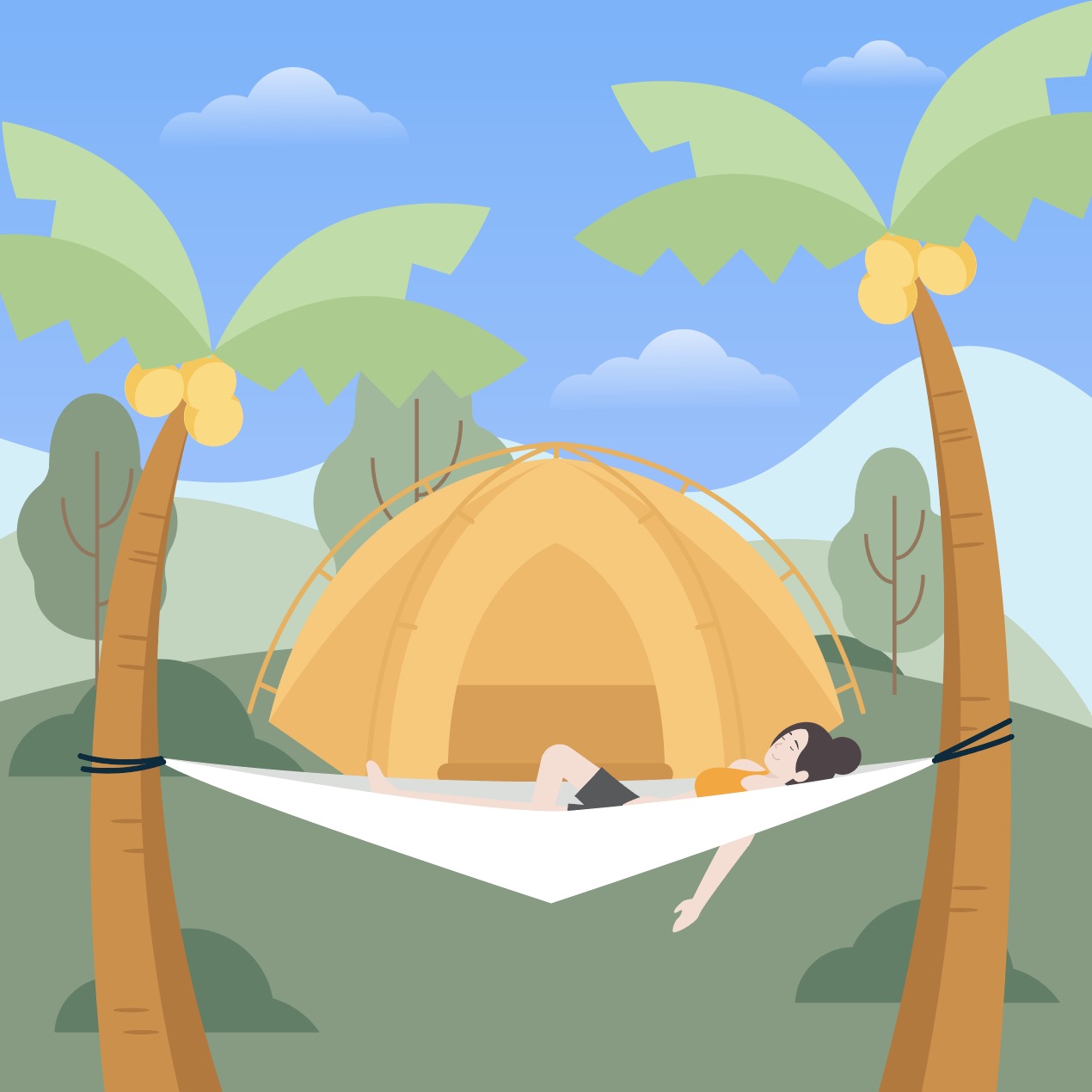 [EN] Hi. It is an urban brush. The image below is a sample summer camping hammock illustration. It is an illustration image expressing a camper sleeping in a hammock with a tent in a summer mountain. It is an illustration image depicting a woman enjoying summer solo camping. It is an illustrative image suitable for use in categories related to camping, campers, women, tents, travel, vacations, vacations, recreation, mountains, forests, and nature. Download the summer camping hammock illustration vector file and use it for design related to travel. If you need a graphic design request, search KakaoTalk “Urban Brush” and contact us. The fonts included are examples and are not included in the file. Please contact the font company for usage.