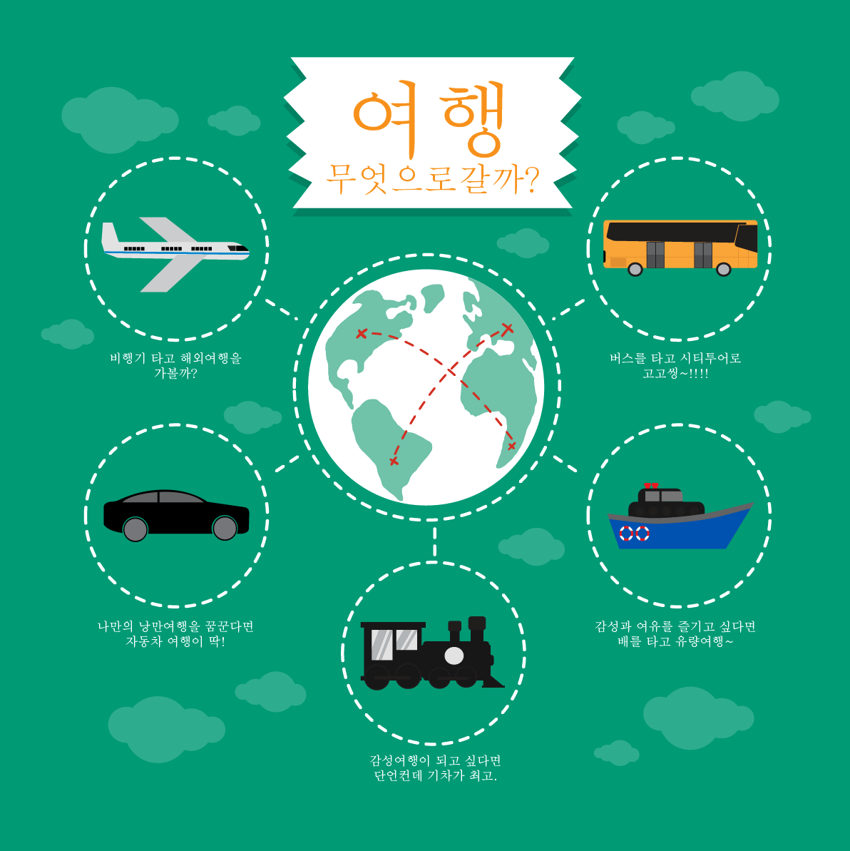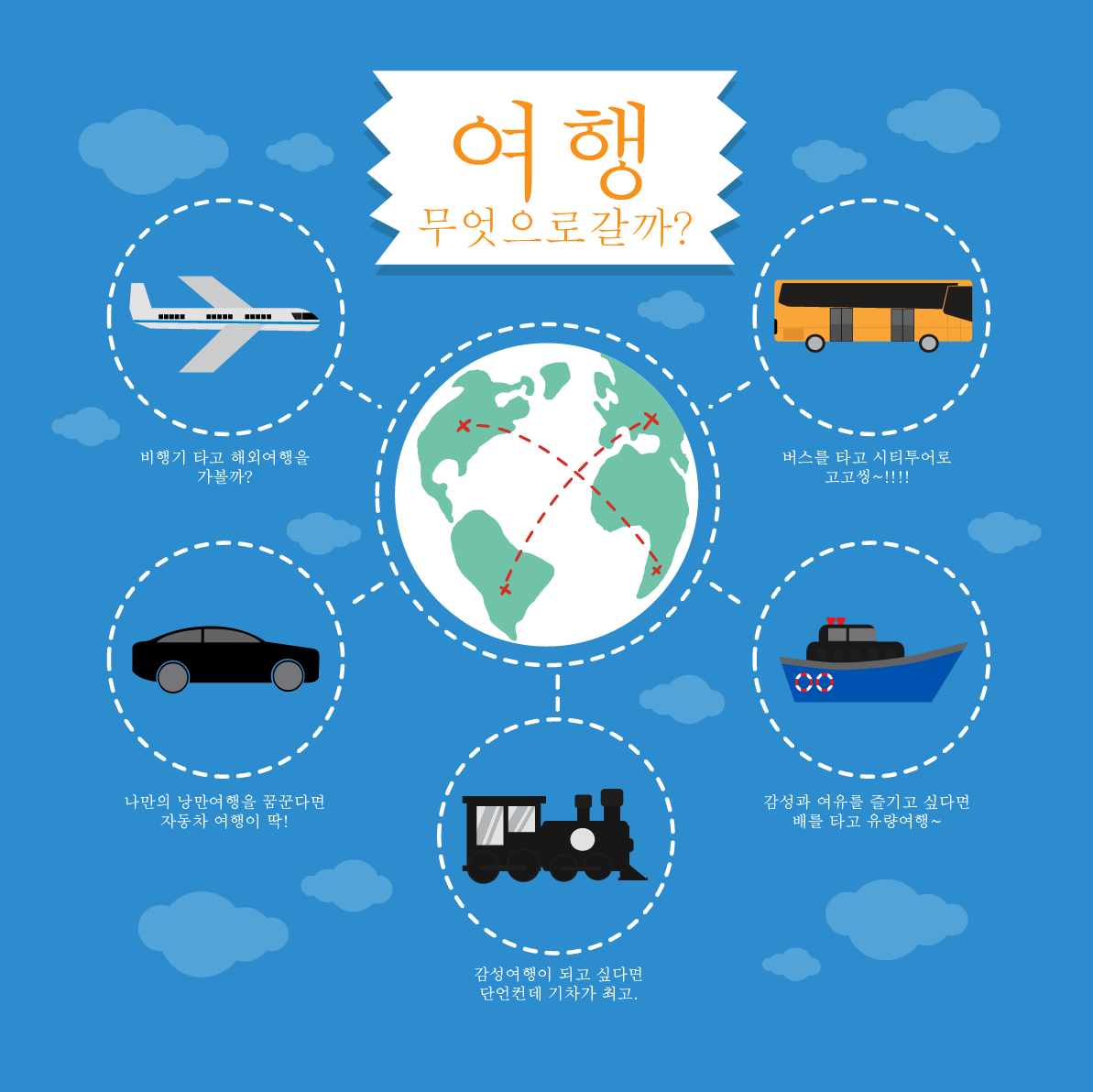 다양한 운송수단, 탈것 일러스트가 포함되어 있으며, 중앙에 지구본 일러스트가 있습니다.