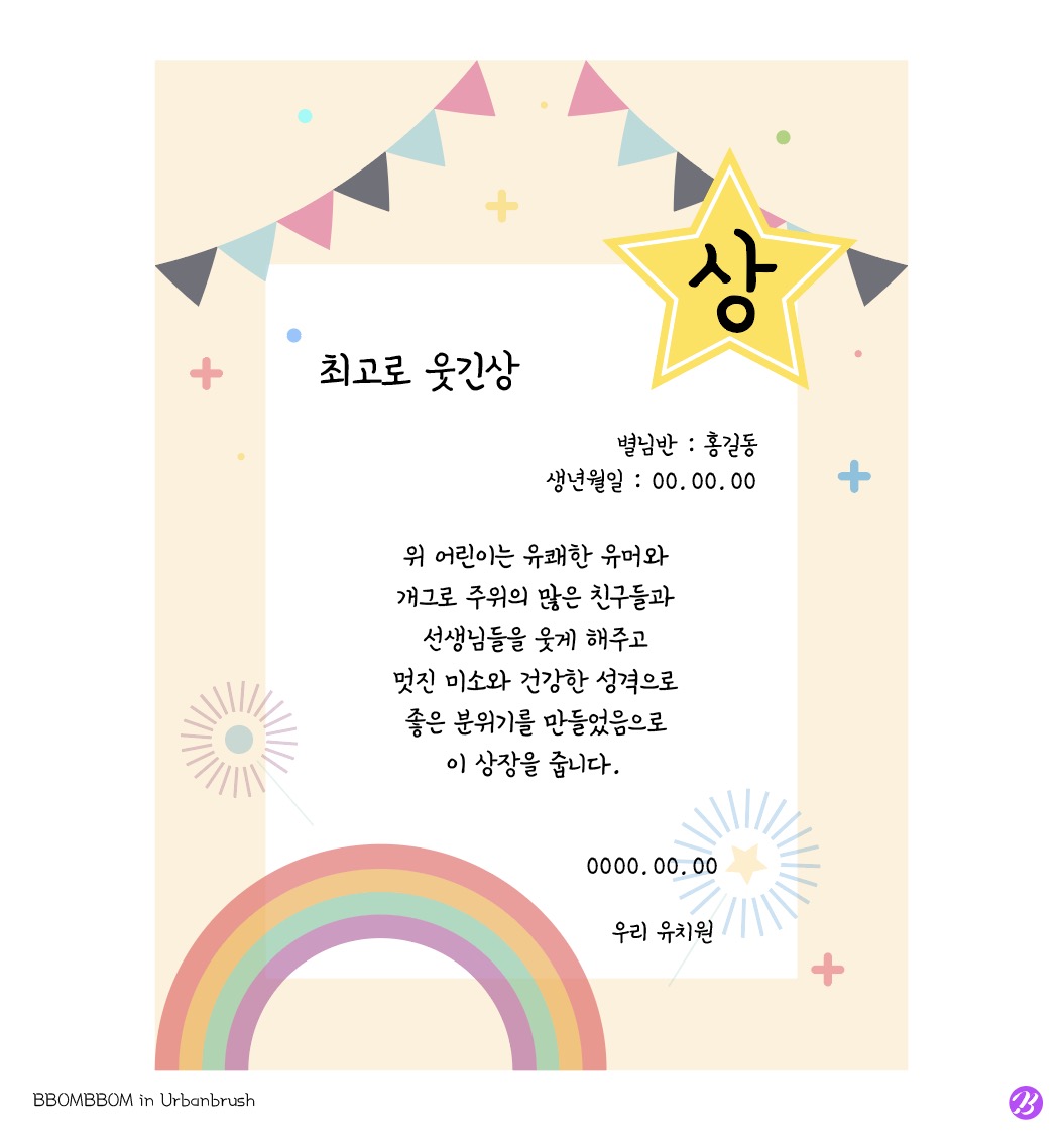 유치원 상장 일러스트 에 대한 이미지 소스 공유 안내입니다. 아래의 내용과 어반브러시의 이용약관을 읽고 이용해주시기 바랍니다. 하이루~!! 디자이너 뽐뽐입니다!! 일러스트와 픽토그램, 아이콘, 로고 등을 전문으로 제작하는 뽐뽐이 디자이너입니다!!!!