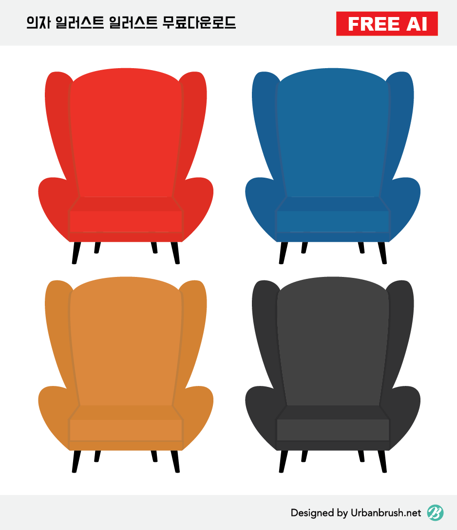 [KR] 안녕하세요. 어반브러시의 Master Creator Tommy입니다. 아래 이미지는 의자 일러스트 ai 파일 샘플입니다. 최근 유행하는 트렌디한 스타일의 의자를 색상별로 구성하여 제작하였습니다. 1인 소파 모양을 하고 있으며, 거실, 인테리어, 독서, 카페, 안락함, 좌석 등과 관련된 디자인물에서 다양하게 활용하기 적합한 일러스트 이미지입니다. 파일을 다운받아 의자와 관련된 디자인물에 활용해보세요.
