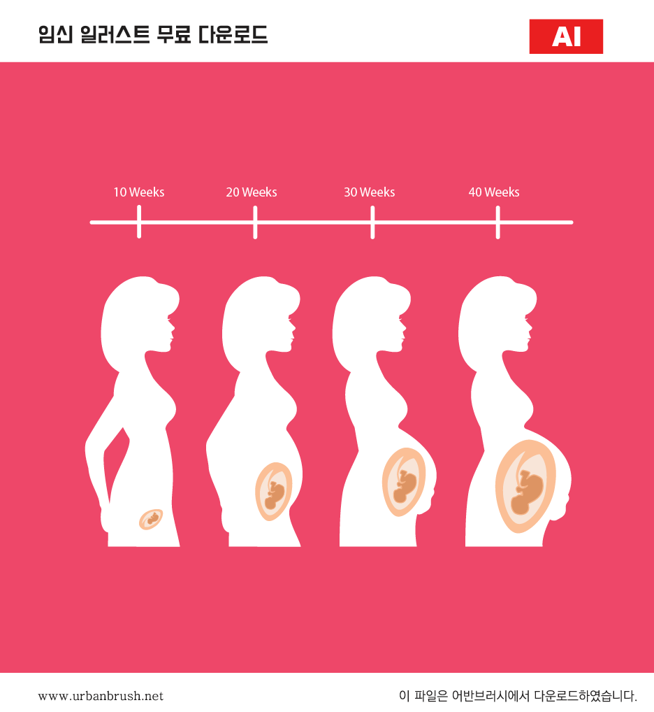 [KR] 안녕하세요. 어반브러시의 Master Creator Tommy입니다. 아래 이미지는 임신 일러스트 ai 파일 샘플입니다. 여성의 임신, 출산, 분만의 과정을 일러스트로 묘사한 이미지입니다. 태아의 크기와 상태가 어떻게 변화되는지 일러스트 그림을 통해서 알 수 있는 이미지이며, 병원, 산부인과, 조리원, 분만원 등에서 활용할 수 있는 이미지입니다. 여성과 관련된 일러스트이기 때문에 핑크색상의 배경을 주었으며, 여성은 실루엣으로 처리하였습니다. 파일을 다운받아 여성의 임신과 관련된 디자인물에 활용해보세요.