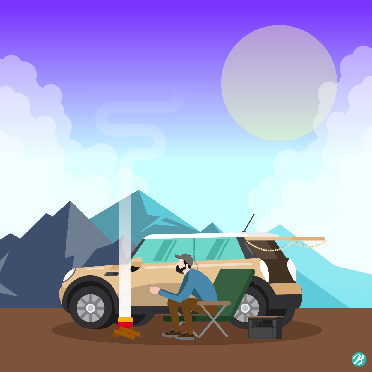 [EN] Hi. This is Tommy, Master Creator of Urban Brush. The image below is a sample car camping vehicle illustration. It is an illustration image that expresses a camper who is camping with a car. It is an illustration image depicting a bonfire next to a Mini Cooper and a fire pit. It is an illustrative image suitable for use in categories related to fire, camper, camping, automobile, vehicle, nature, camping, and travel. Download the car camping car park illustration vector file and use it for design related to the car. Included fonts are examples and are not included in the file. Please inquire with the font company for use.