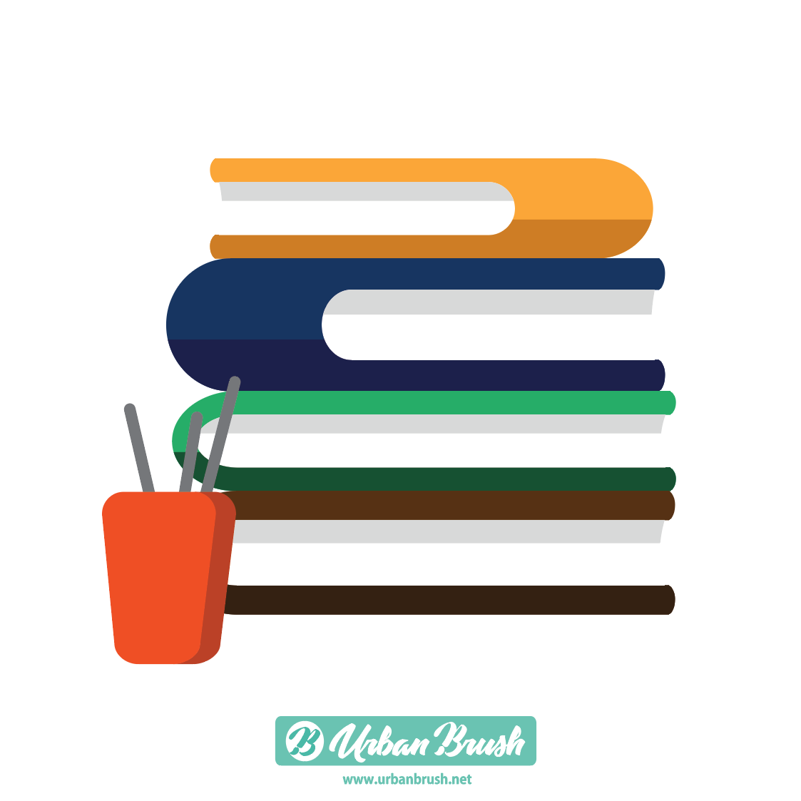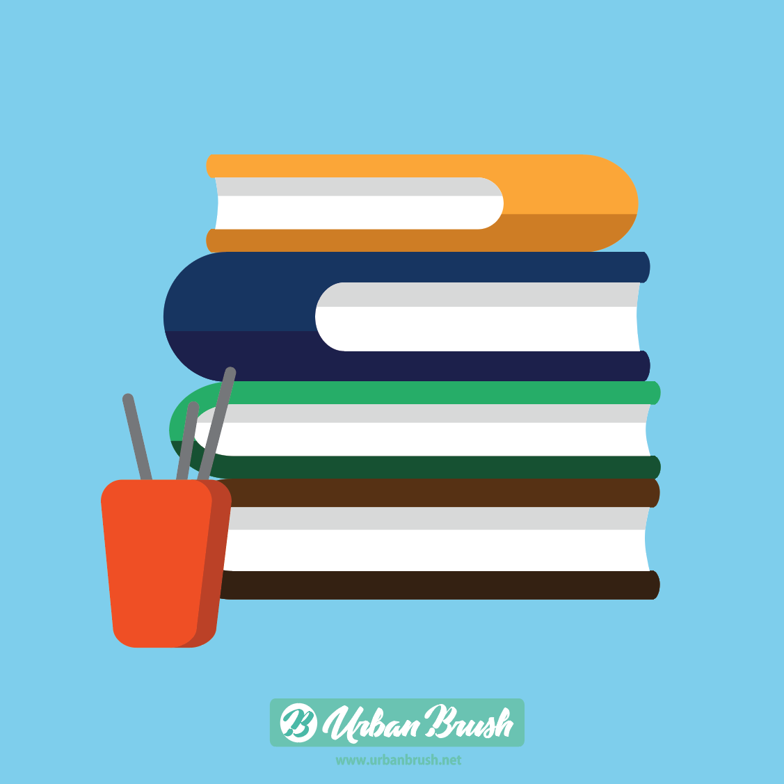 몇권의 책이 쌓여져 있는 모습을 하고 있으며, 좌측에는 필통이 있습니다.