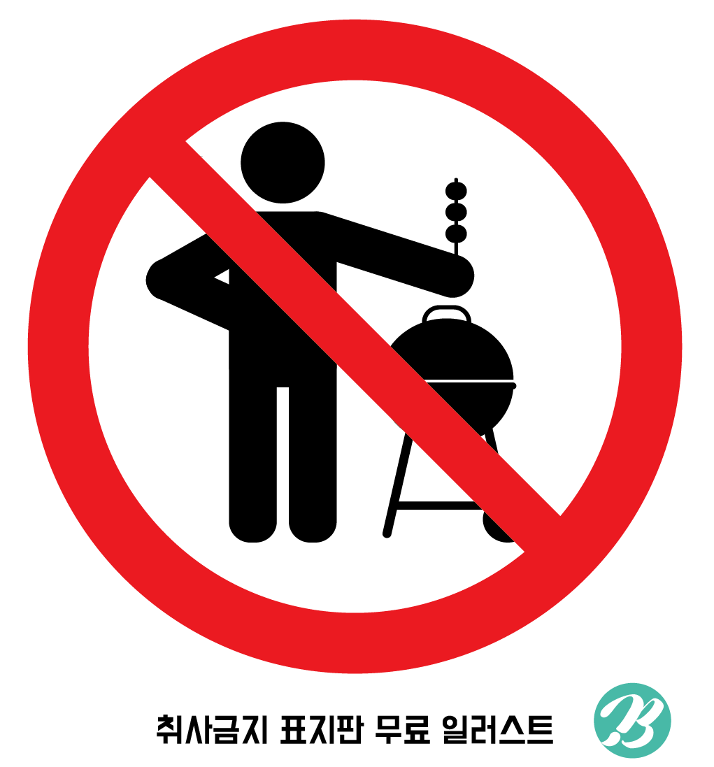 BBQ 모양의 일러스트가 포함되어 있으며, 기존의 취사금지구역 표지판과 다른 독특한 디자인입니다.