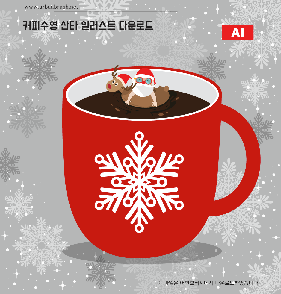 [KR] 안녕하세요. 어반브러시의 Master Creator Tommy입니다. 아래 이미지는 커피 수영 산타 일러스트 ai 파일 샘플입니다. 크리스마스 분위기가 나는 커피컵 안에 산타가 루돌프 튜브를 타고 수영하는 장면을 묘사한 일러스트 이미지입니다. 커피숍, 커피전문점, 카페 등에서 크리스마스 시즌에 활용할 수 있는 일러스트 이미지입니다. 파일을 다운받아 커피와 관련된 디자인물에 활용해보세요.