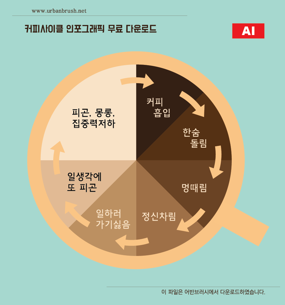 [KR] 안녕하세요. 어반브러시의 Master Creator Tommy입니다. 아래 이미지는 커피 인포그래픽 일러스트 ai 파일 샘플입니다. 커피를 찾는 사람의 심리를 커피잔과 화살표로 표현한 커피 인포그래픽 일러스트 이미지입니다. 카페, 커피전문점, 커피숍 등에 활용할 수도 있고, 커피와 관련된 홍보물에서 활용할 수 있는 일러스트 이미지입니다. 파일을 다운받아 커피 사이클 인포그래픽을 제작해보세요.