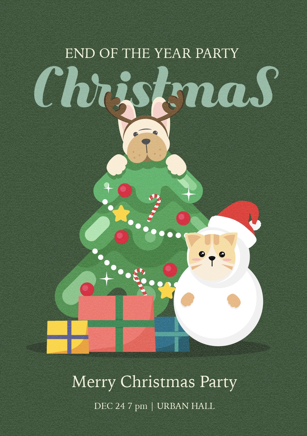 [EN] Hi. This is Urban Brush. The image below is a sample of a Christmas party poster pet illustration ai. It is an illustration image expressing a poster design template advertising a Christmas party with pets. This is an illustration image depicting a Christmas party poster. It is an illustration image suitable for use in categories related to pets, companion dogs, Christmas posters, Christmas poster designs, poster templates, puppies, cats, companion dogs, pets, companion cats, etc. Download the Christmas party poster pet illustration ai vector file and use it for designs related to Christmas posters. If you need to request a graphic design, please search for “Urban Brush” on KakaoTalk and contact us. The included fonts are examples and are not included in the file. Please contact the font company for usage.
