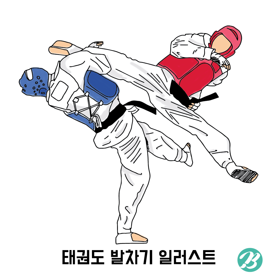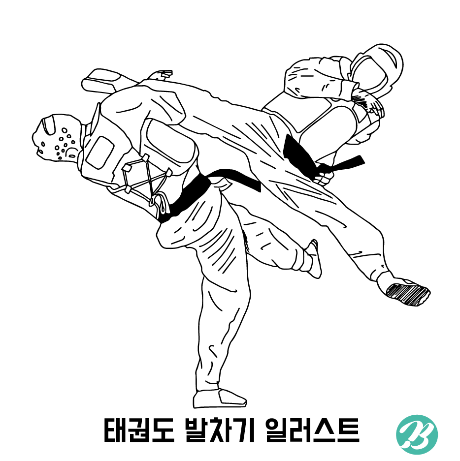 태권도 대련 중 일러난 멋진 발차기 포즈를 일러스트로 제작하였습니다.