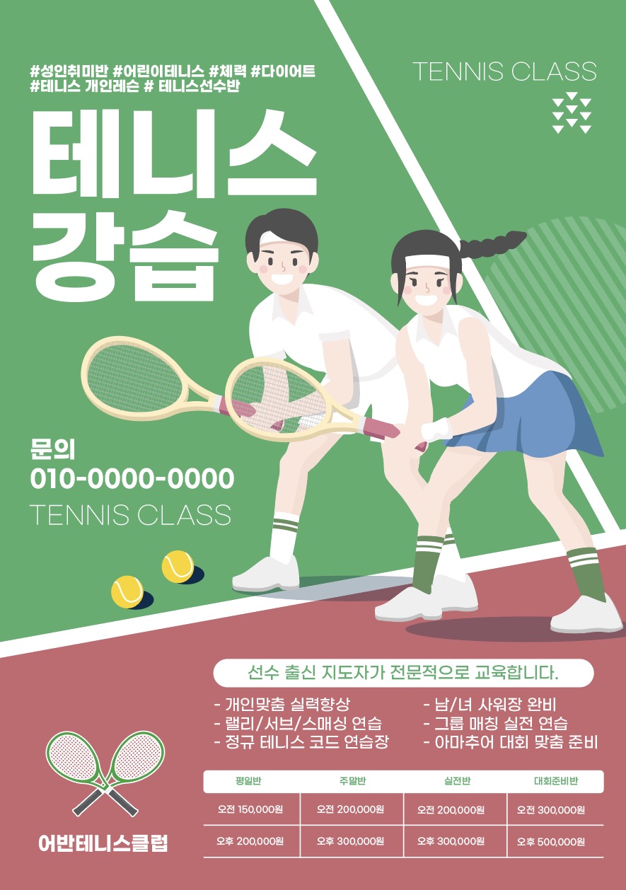 [EN] Hi. This is Master Creator Tommy of Urban Brush. The image below is a sample of ai for a tennis tournament poster design. This is an illustration image expressing a tennis tournament poster. This is an illustration image depicting a poster flyer design related to tennis sports. This is an illustration image suitable for use in categories related to tennis posters, flyers, hobbies, sports, exercise, couples, tennis tournaments, etc. Download the ai vector file for a tennis tournament poster design illustration and use it for designs related to tennis poster design. If you need to request a graphic design, please search for “Designer Tommy” on KakaoTalk and contact us. The included fonts are examples and are not included in the file. Please contact the font company for information on use.