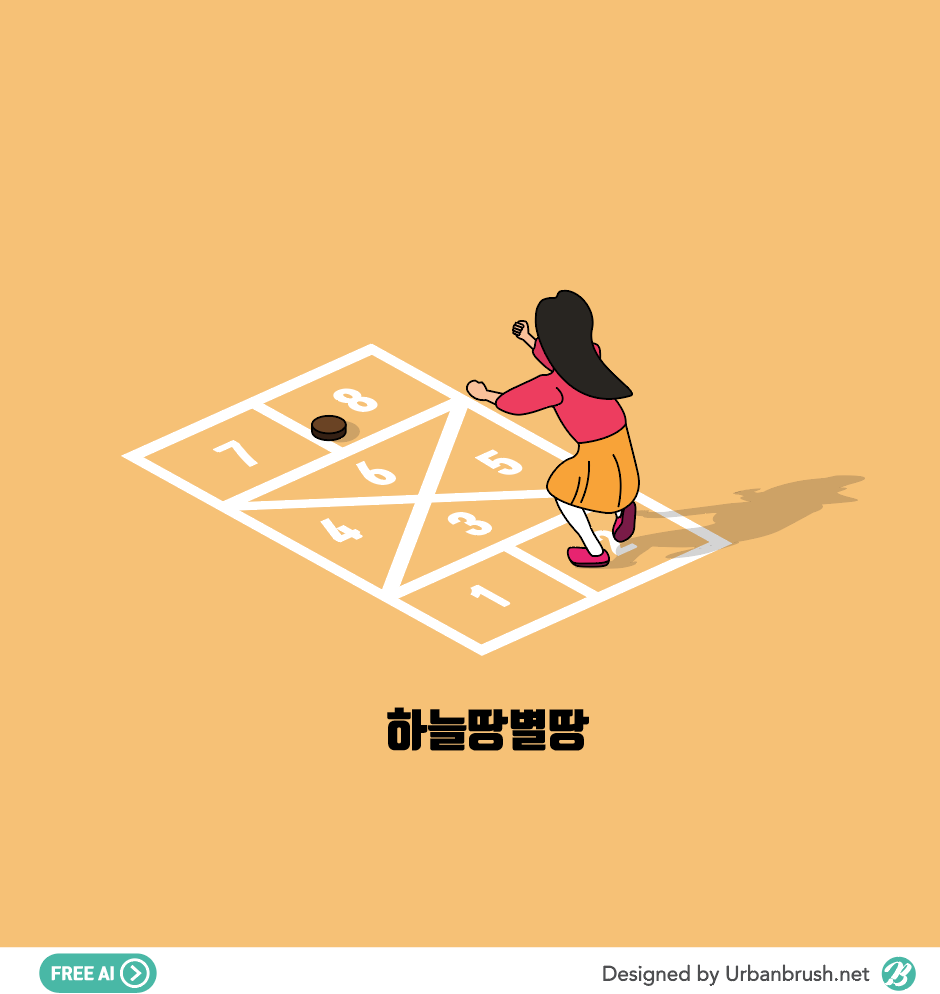 [KR] 안녕하세요. 어반브러시의 Master Creator Tommy입니다. 아래 이미지는 사방치기 게임 일러스트 ai 파일 샘플입니다. 어릴적 땅에 그림을 그려 게임하던 하늘땅 별땅을 묘사한 일러스트 이미지입니다. 여자 어린이가 바닥에 그려진 라인을 따라 게임을 하고 있는 모습을 표현한 일러스트 이미지입니다. 게임, 한국게임, 전통게임, 놀이, 전통놀이, 어린이 등과 관련괸 카테고리에서 활용하기 적합한 일러스트 이미지입니다. 하늘땅별땅 게임 일러스트 백터파일을 다운받아 게임과 관련된 디자인물에 활용해보세요.
