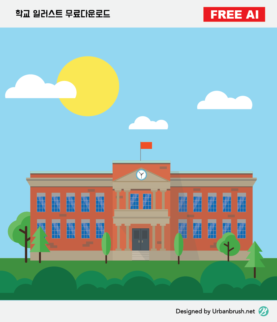 [EN] Hi. Urban Brush’s Master Creator Tommy. The image below is a sample ai file sample of a school. It is an illustration image that expresses the school spread over a clear sky cloud and the green lawn where the sun rises. It is an illustrative image suitable for education, school, entrance, graduation, school, and other related categories. It is a traditional red brick school, with pillars, flags and clocks that emphasize the school image. Download the file and use it for school related design.
