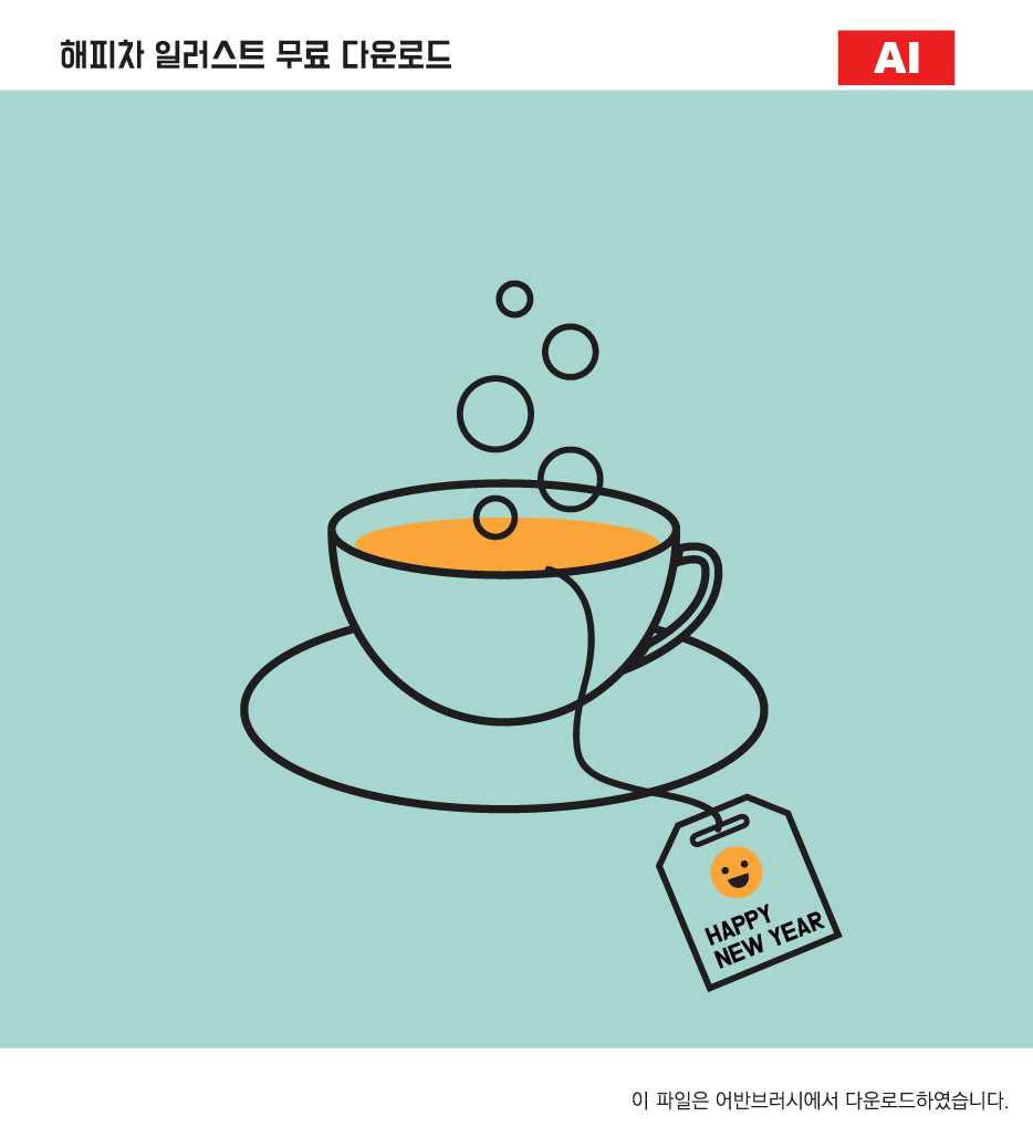 [KR] 안녕하세요. 어반브러시의 Master Creator Tommy입니다. 아래 이미지는 해피 차 일러스트 ai 파일 샘플입니다. 신년, 새해를 맞이해서 해피라는 티백을 넣은 차를 디자인한 일러스트 이미지입니다. 노란색의 티백에 스마일마크와 “Happy New Year”라는 글씨가 새겨져 있고, 커피잔에 티백에서 우려나온 노란색 해피차가 표현되어 있습니다. 파일을 다운받아 신년, 새해 이미지에 활용해보세요.