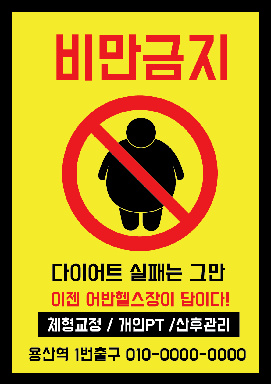 비만금지 아이콘을 활용해서 간단한 문구만 포함시킨 직관적인 헬스장 전단지입니다.