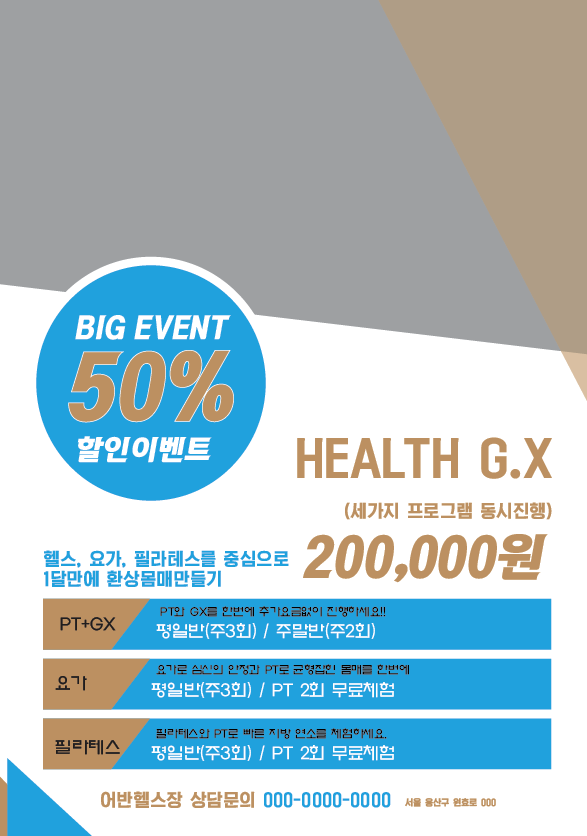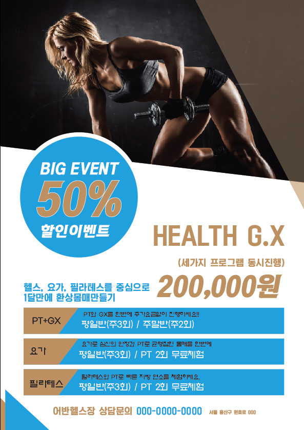 일반적인 헬스장에서 오픈행사나 시즌행사 때 사용할 수 있는 간단한 시안입니다.