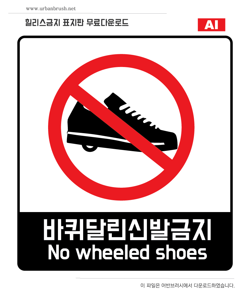 [KR] 안녕하세요. 어반브러시의 Master Creator Tommy입니다. 아래 이미지는 바퀴달린신발 금지 표지판 일러스트 ai 파일 샘플입니다. 최근 마트나 공공장소에서 어린들의 힐리스 신발 사고가 많아지고 있습니다. 이를 예방할 목적으로 제작된 힐리스 금지 표지판 일러스트 이미지입니다. 파일을 다운받아서 힐리스 금지와 관련된 디자인물에 활용해보세요.