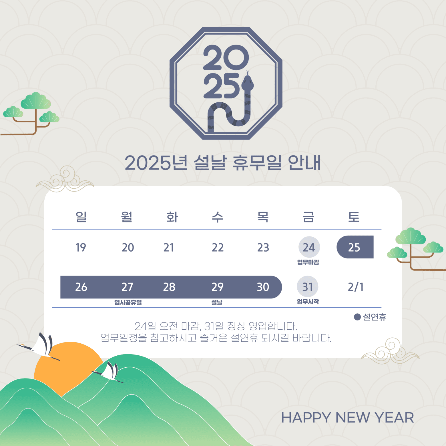 추천 카테고리 : 설연휴 안내, 설날연휴안내, 설명절 연휴안내, 2025년, 을사년, 뱀띠, 뱀의해, 푸른뱀의해, 전통, 설날, 새해, 구정, 신정, 새해인사, 새해인사말, 한국전통문양, 뱀 캐릭터, 2025새해일러스트, 푸른뱀캐릭터, 을사년새해인사, 신년일러스트, Seollal holiday notice, Seollal holiday notice, Seollal holiday notice, 2025, Year of the Snake, Year of the Snake, Year of the Blue Snake, tradition, Seollal, New Year, Lunar New Year, New Year’s Day, New Year’s greetings, New Year’s greetings, Korean traditional patterns, snake character, 2025 New Year’s illustration, blue snake character, Year of the Snake New Year’s greetings, New Year’s illustration