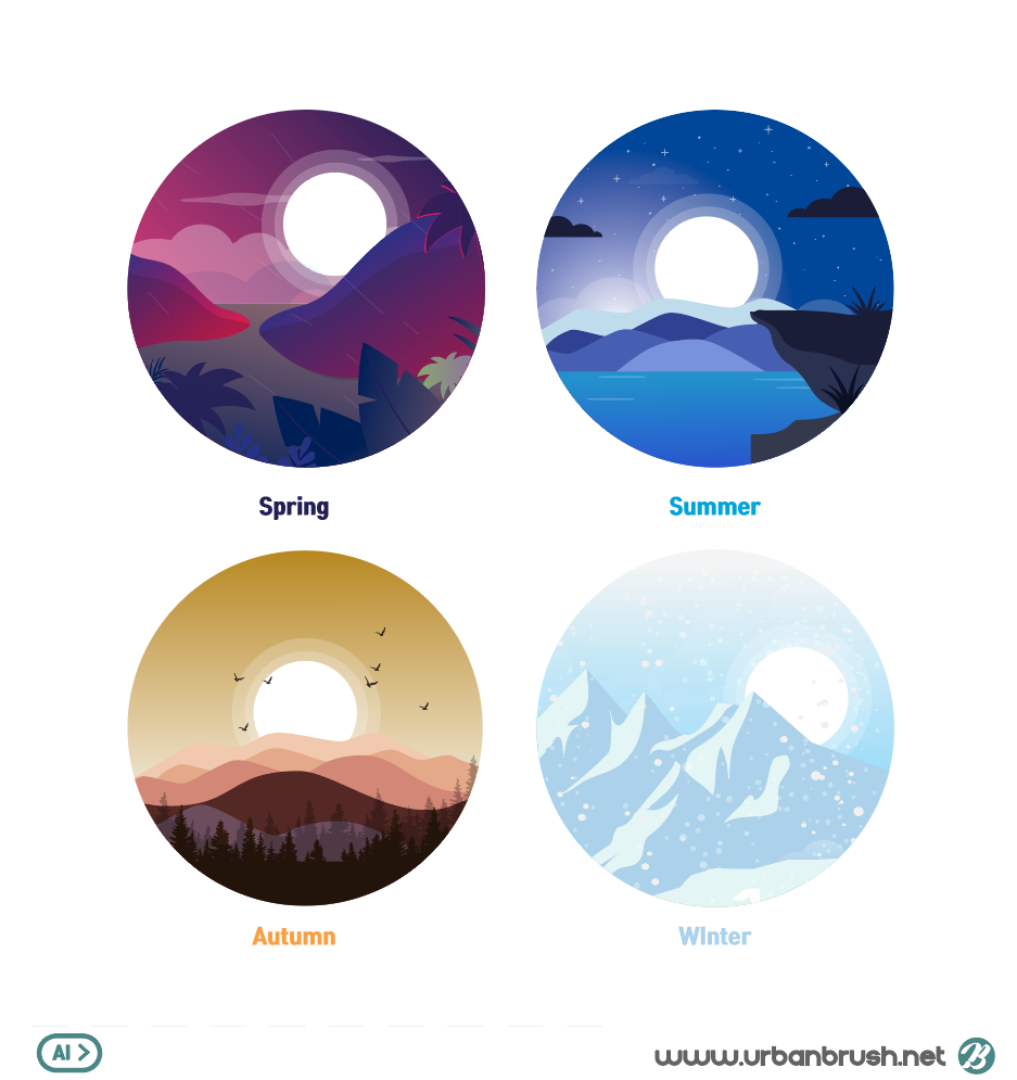 Hi. Urban Brush’s Master Creator Tommy. The image below is a sample of 4 season illustrations ai file. It is a season illustration image that is decorated with the background of other seasons according to the shape of the same sun. In the spring, the lake expresses the area around the lake where the spring rain falls. In summer, it expresses the beach of the clear night sky. In the autumn, it depicts the blue fields and migratory birds as the background of the setting sun. Use them for each season’s themes, using features and colors to suit each season. Four seasons, four seasons, season, season, spring, summer, fall, winter and other categories are suitable for use in the illustrations. Download 4 season vector files and apply them to the design related to the season.