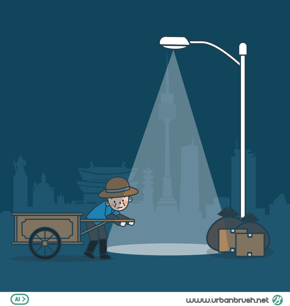 Hi. Urban Brush’s Master Creator Tommy. The image below is a sample of ai file showing abolition of an elderly man picking up. It is an illustration image expressing an elderly person picking up a waste paper box piled up under a Seoul night sky street light. It is an illustration image that depicts scenes where garbage and boxes are placed under a streetlight on a Seoul silhouette background, and an elderly person draws a rear car. Elderly people living alone, elderly, elderly, seniors jobs, living expenses and other categories, such as illustrations are suitable for use in the image. Download the old vector illustration file to find the abolition of elderly poverty, please use the design related to the elderly.