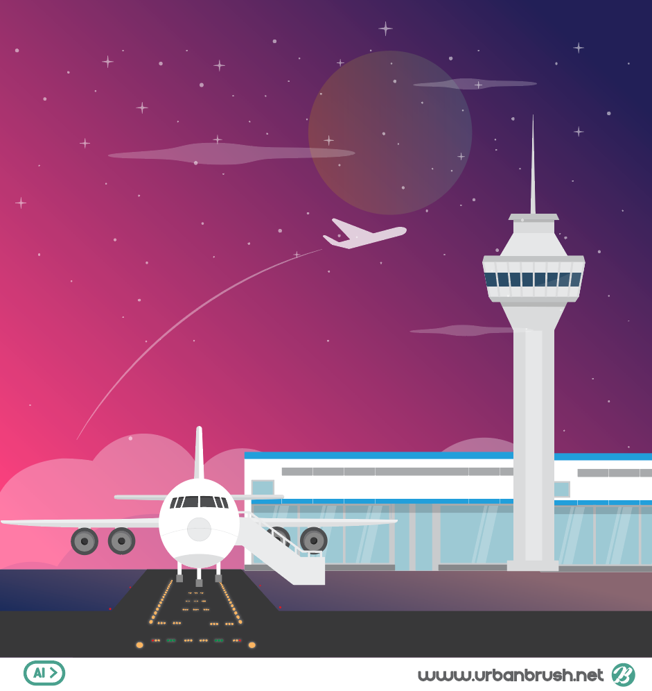 Hi. Urban Brush’s Master Creator Tommy. The image below is a sample of the airport illustration ai file. It is an illustration image expressing runway and control tower of airport. The airports, control towers, and airport buildings are depicted on the runway of the airport, together with the aircraft flying to the sky. It is an illustrative image suitable for use in categories related to airports, airports, runways, control towers, airplanes, and travel. Download airport illustration vector file and use it for design related to travel.
