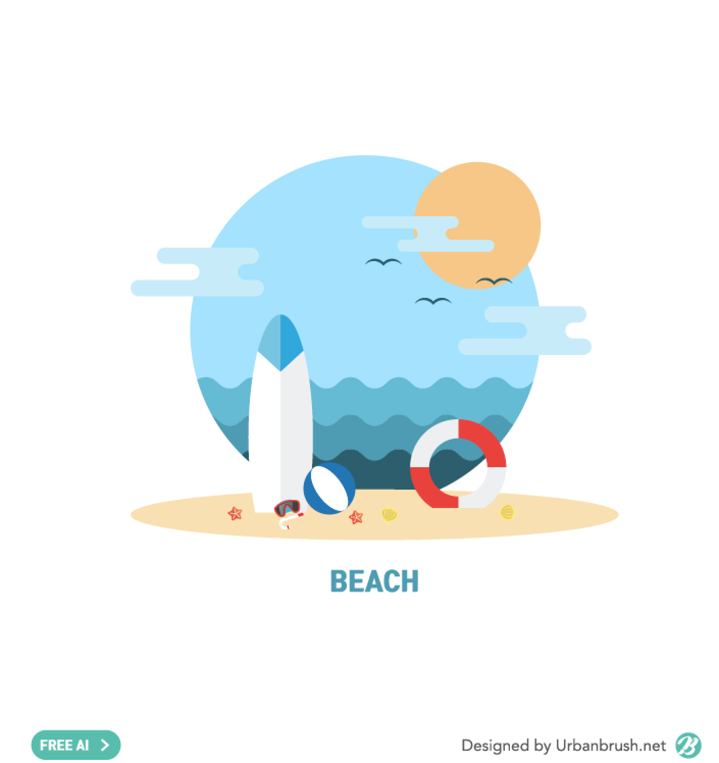 Hi. Urban Brush’s Master Creator Tommy. The image below is a sample ai file on the beach. An image of a beach in an illustration file. There are surfboards, starfish, beach balls, tubes, shells and snorkeling in a clear sky with clouds, sun, and seagulls. Summer, vacation, beach, sea, swimming beach and related categories are suitable for illustrative images. Download the beach illustration file and use it for summer related design.