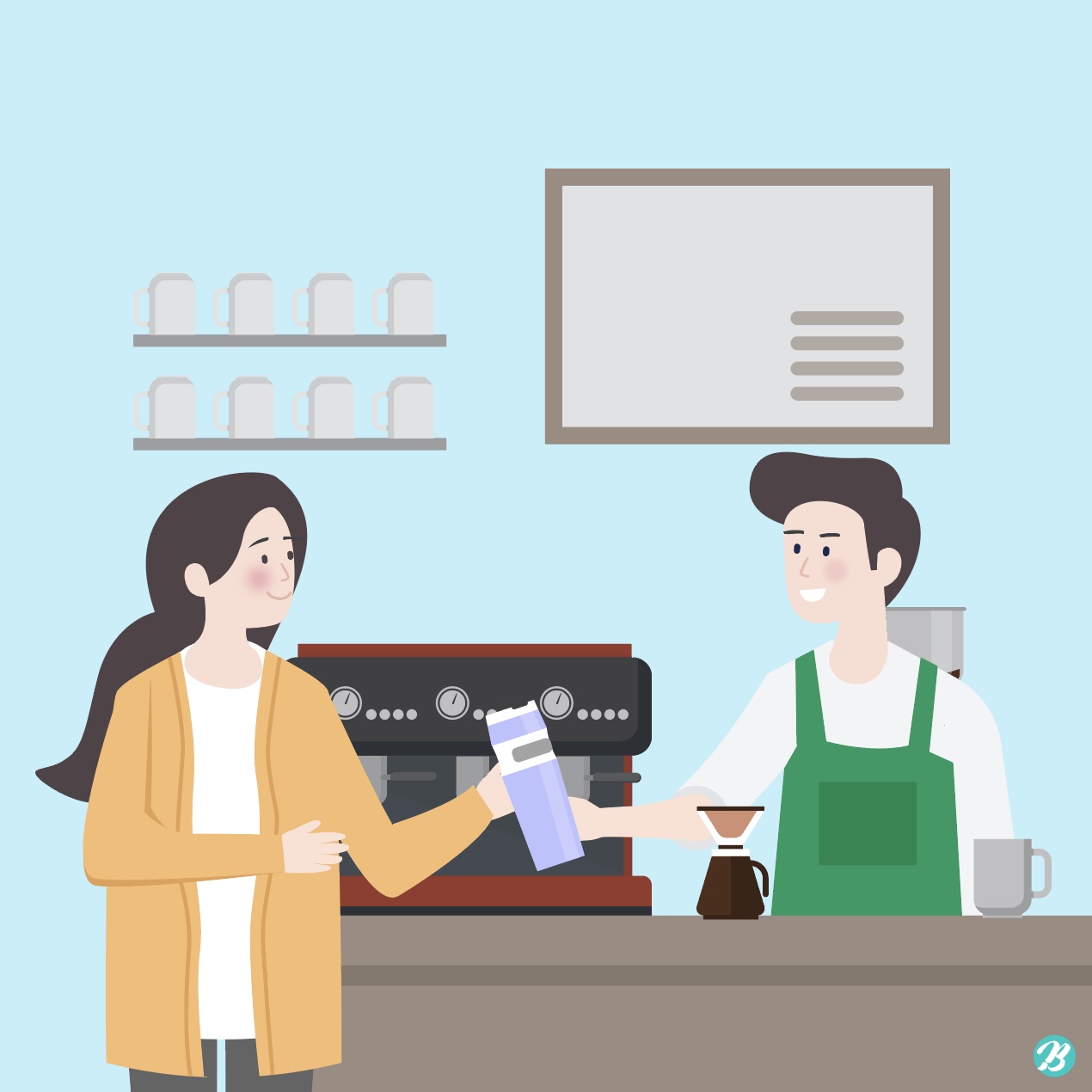 This is Tommy, Master Creator of Urban Brush. The image below is a sample cafe illustration using a tumbler. It is an illustration image expressing the appearance of exchanging tumblers in a cafe. It is an illustration image depicting a cafe using a tumbler. This is an illustrative image suitable for use in categories related to tumbler, cafe, barista, eco-friendly, ESG, nature conservation, and environmental protection. Download the cafe illustration vector file using Tumblr and use it for ESG-related design. Included fonts are examples and are not included in the file. Please inquire with the font company for use.